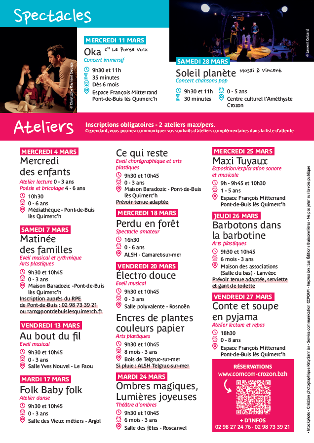 Tout le programme* et liens pour les inscriptions de cette édition 2025 sur www.comcom-crozon.bzh, rubrique « enfance-Jeunesse » / « Petite enfance ».